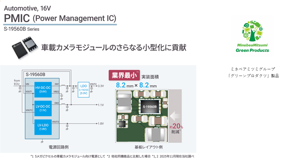 ミネベアミツミグループのエイブリック株式会社(社長:田中 誠司、本社:東京都港区、以下:ABLIC)は本日より、車載用カメラモジュール向け16V動作3チャネル出力のパワーマネジメントIC(以下、PMIC)「S-19560Bシリーズ」の販売を開始しました。