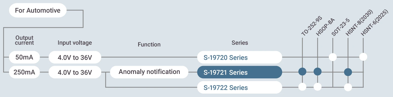 また、出力電流は250mA出力が可能。50mA出力のS-19720と用途によって使い分けが可能です。