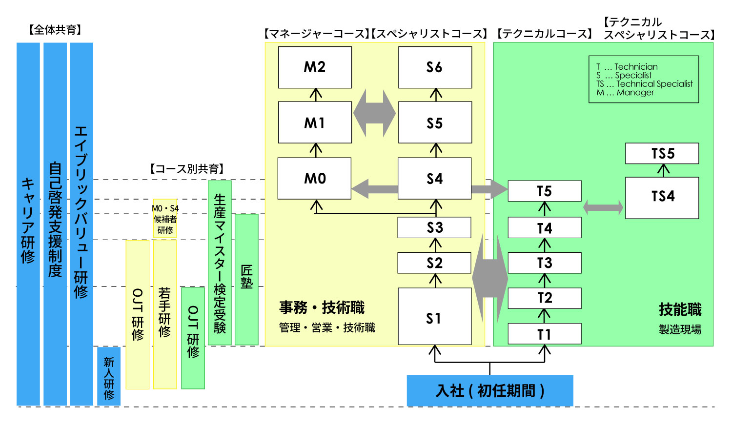 | 匠塾 (T1~T4) | 「固有技術・技能の伝承」と「製造現場のものづくり力向上」を目的として、高度な設備保全技術を学べる場を設けており、世界で戦える技術を習得します。 また国家技能試験および自主保全士検定の合格を目指して定期的に社内勉強会も行っています。 ※現在秋田事業所でのみ実施しています。 |