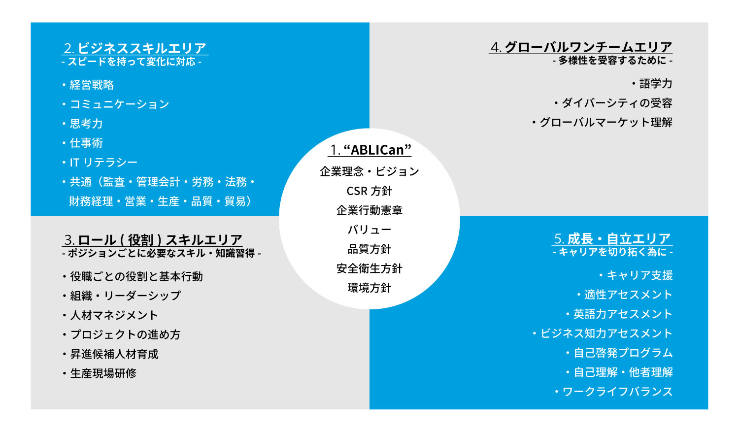 | 全体共育 | エイブリック新人研修 AEPM (Ablic Entry Program) | 入社から約1か月に亘って会社やエイブリックバリューの理解、ビジネスに必要な意識と立ち振る舞いを学びます。 |